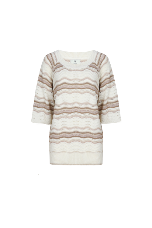 De Alida trui is een verfijnde knit met een speels en vrouwelijk karakter. Het model heeft een ronde hals, een normale lengte en driekwart mouwen, wat zorgt voor een comfortabel en elegant silhouet. De opengewerkte structuur en het subtiele streeppatroon geven de trui een luchtige en unieke uitstraling. De zachte stof draagt prettig en maakt dit item perfect te combineren met een pantalon voor een stijlvolle look of met denim voor een ontspannen, alledaagse outfit.