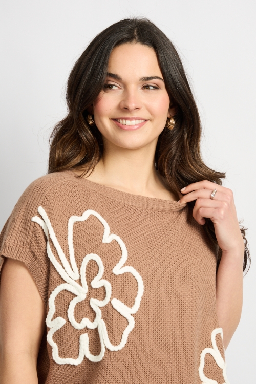 De Violette trui is een comfortabele knit met een speelse en vrouwelijke uitstraling. Het model heeft een ronde hals, een losvallende pasvorm en korte mouwen, wat zorgt voor een ontspannen silhouet. De contrasterende bloemdetails geven de trui een opvallend en uniek accent, terwijl de zachte structuur van de stof prettig draagt. Perfect te combineren met een pantalon voor een stijlvolle look of met denim voor een casual, alledaagse outfit.