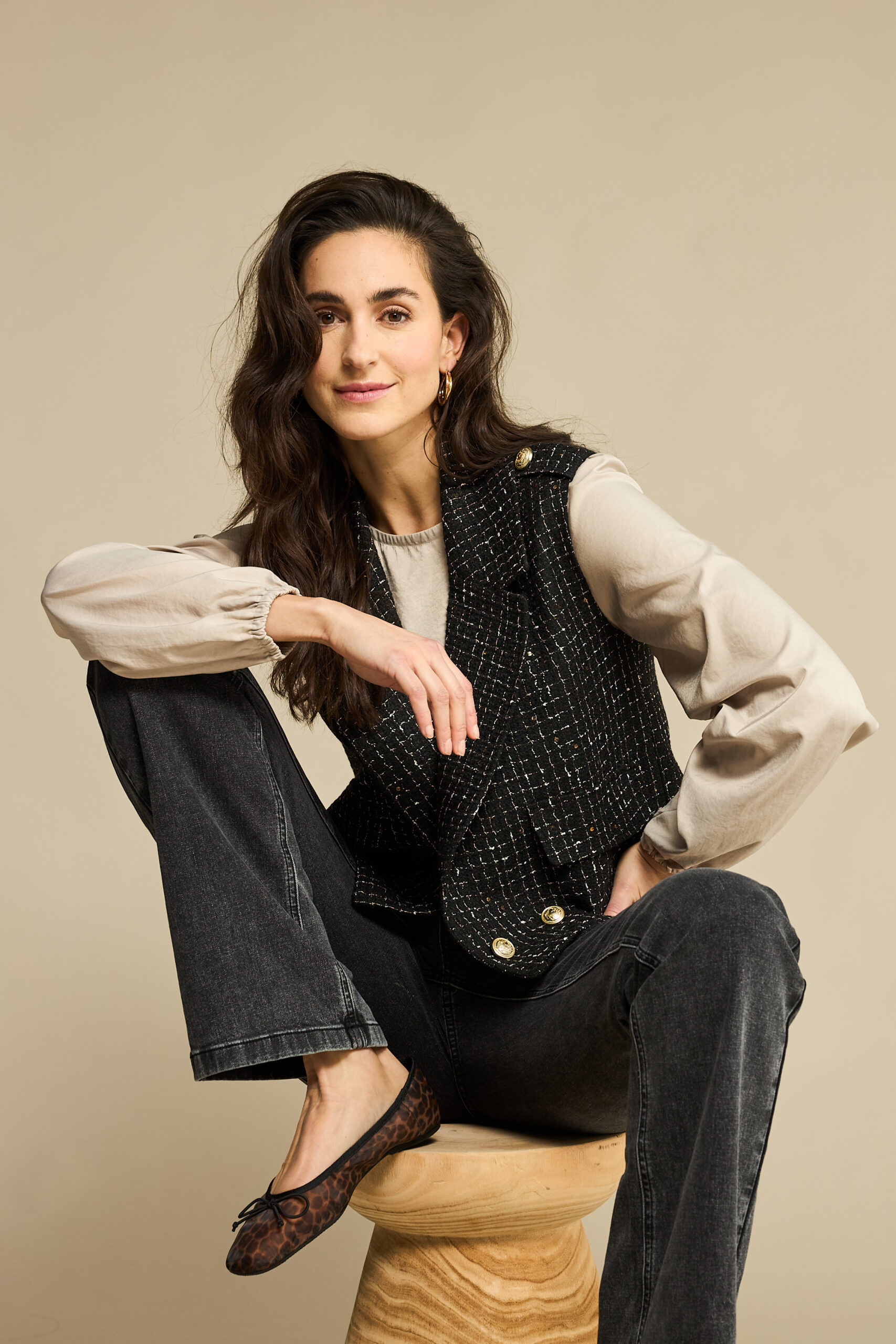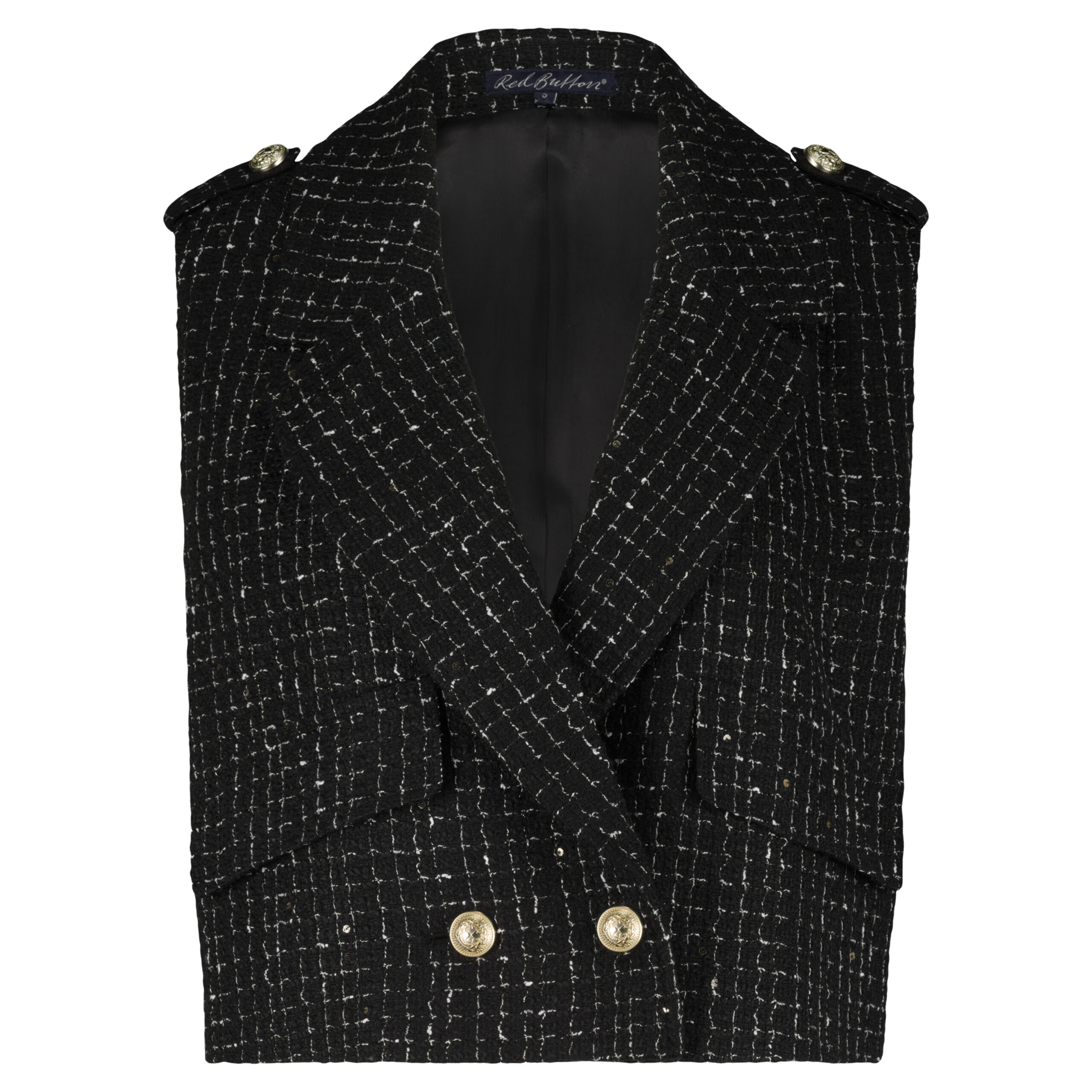 De Skipper Sleeveless Boucle is een waistcoat gemaakt van een boucle/tweed kwaliteit. Deze waistcoat heeft pailletten door het garen waardoor de waistcoat een subtiel glitter detail heeft. De Skipper Sleeveless Boucle heeft een reverskraag, een double breasted knoopsluiting en sierzakken aan de voorkant.