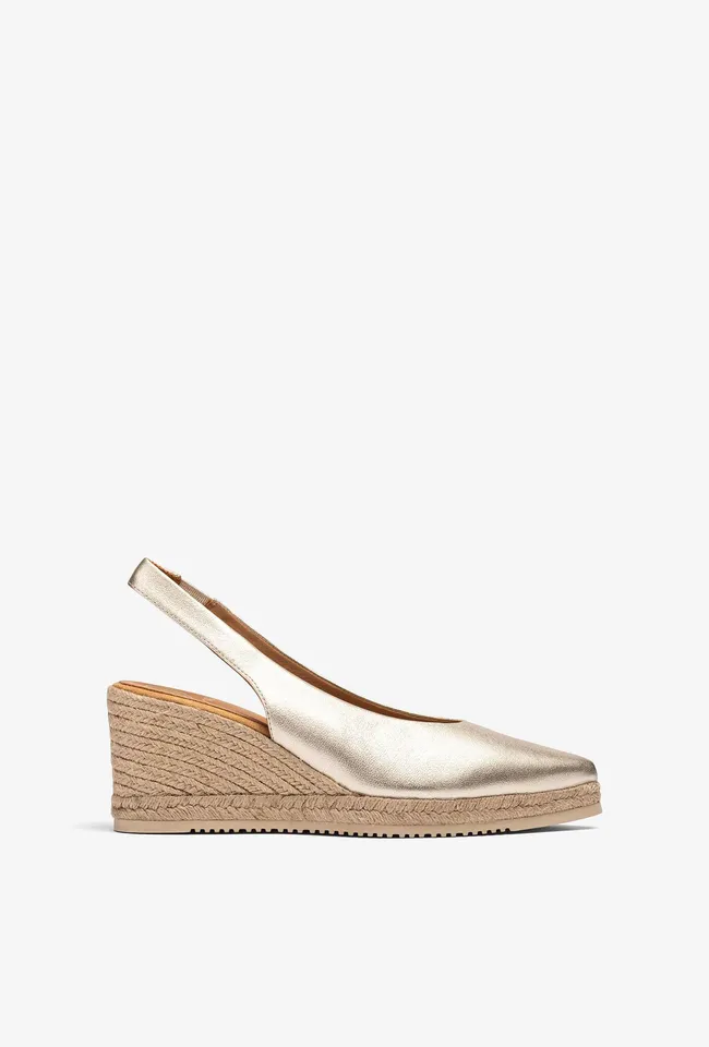 Espadrilles met spitse neus, gemaakt van metallic leer. Met jute beklede sleehak van 7,5 cm hoog, met een plateauzool van 2 cm. Lichtgewicht, flexibele en antislip rubberen zool. Een perfect ontwerp voor wie wil opvallen met elegantie.